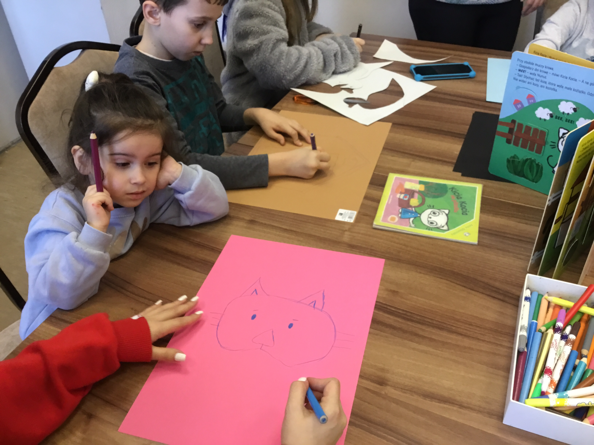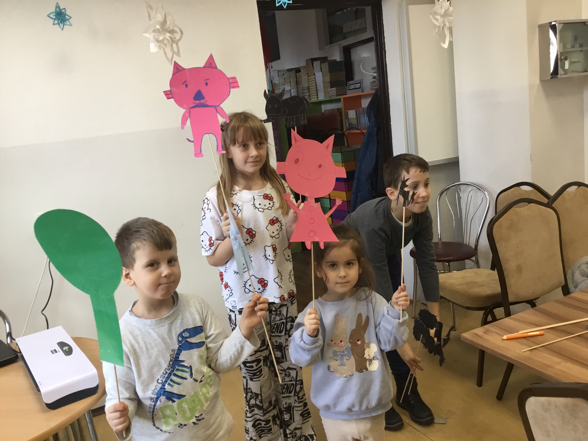 Zabawa w teatr trwa. Dzieci wybrały książkę pt "Kicia kocia ", na podstawie której będą tworzyć mini spektakl teatralny. Po przeczytaniu opowiadania dzieci skupiły się na tworzeniu, malowaniu postaci na kolorowych kartkach. Po wycięciu, papierowe postacie przykleiły do drewnianych patyczków. Każda postać i element ważny w opowiadaniu nabierał charakteru a w rączkach dzieci ożywał i powoli powstawała mała inscenizacja teatralna. Na kolejne spotkanie zapraszamy w poniedziałek o godz. 13:00.