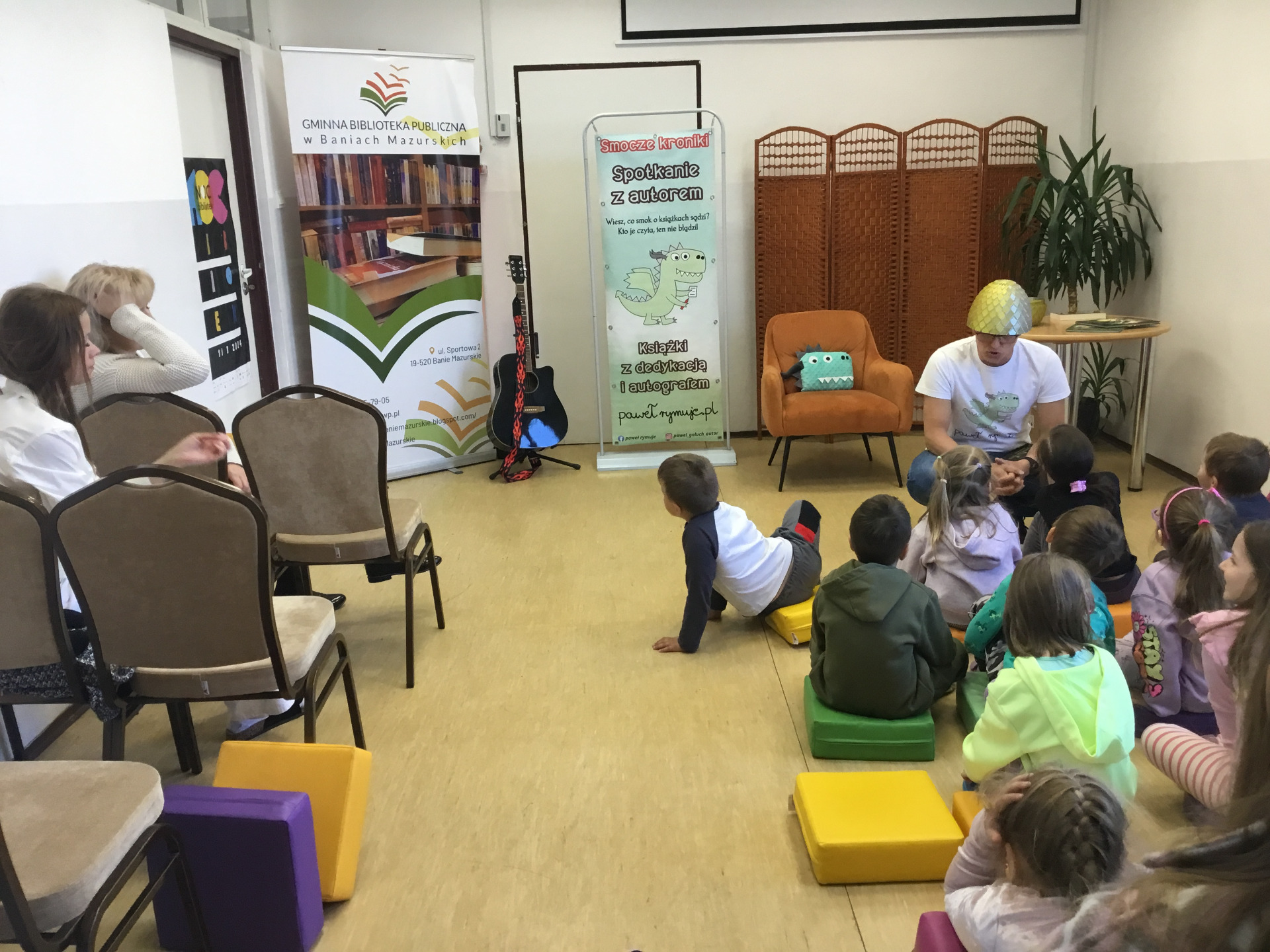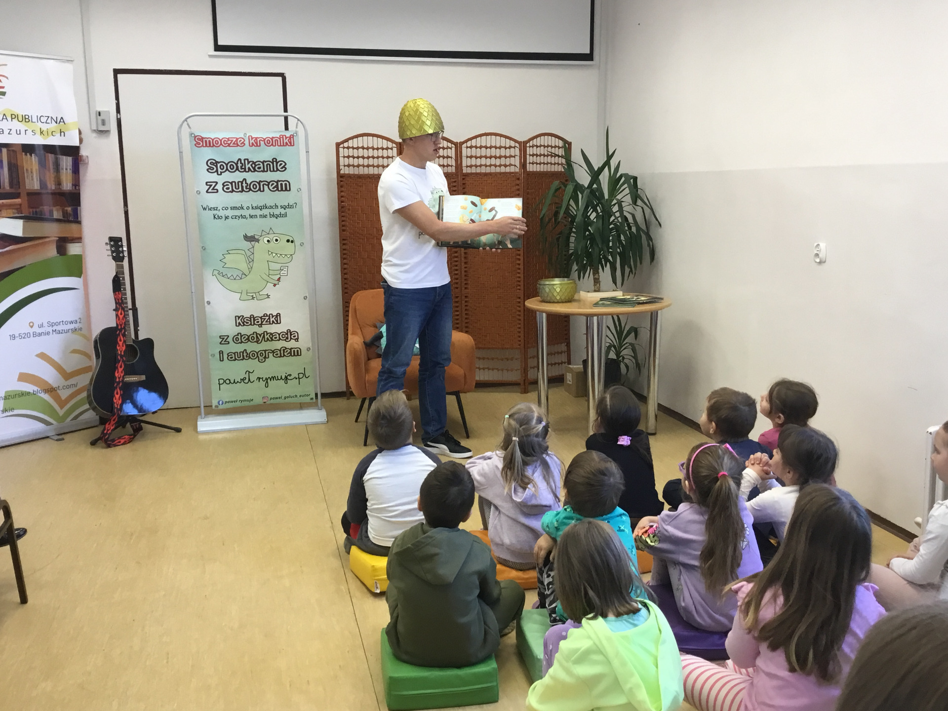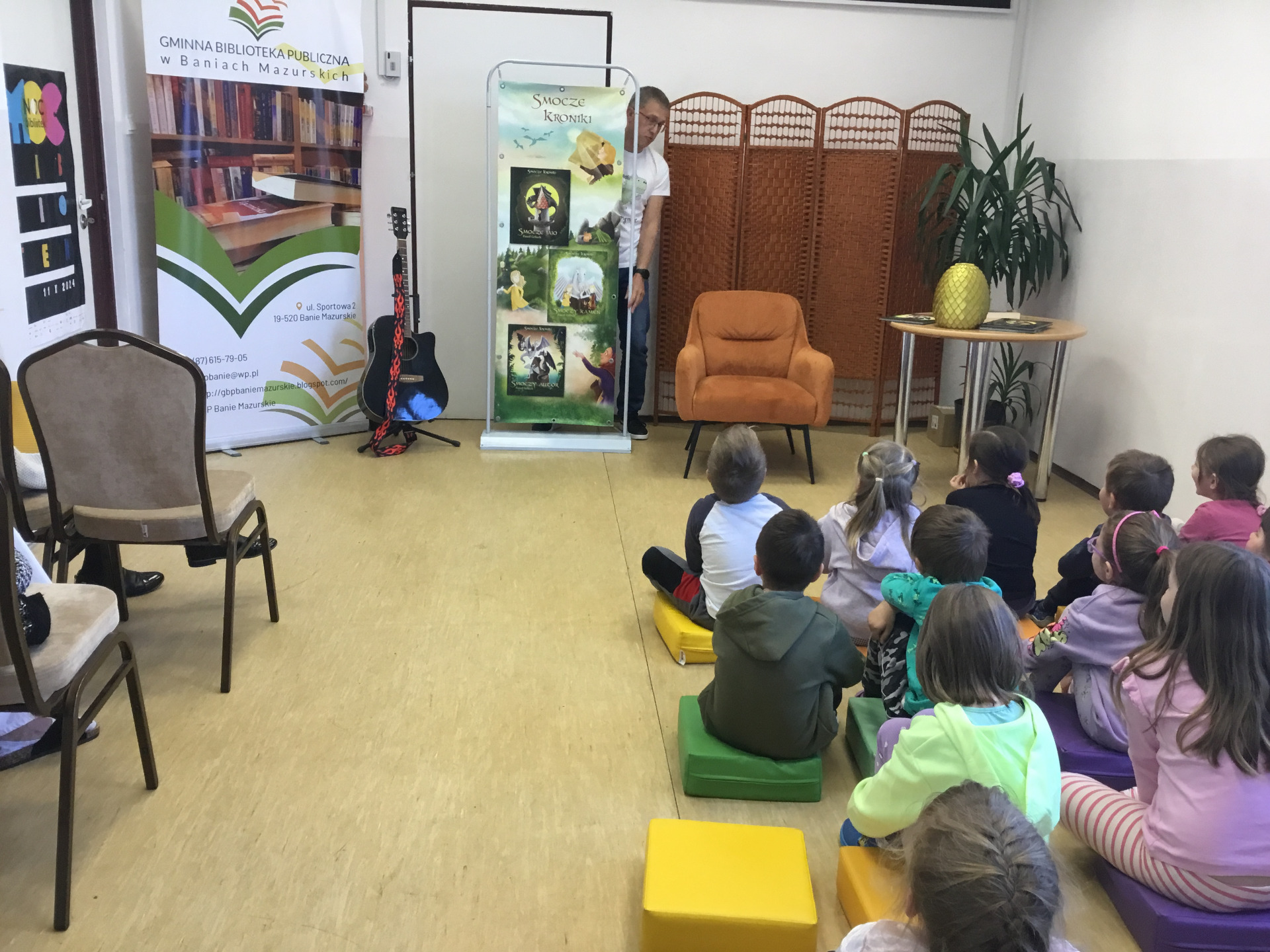 13 maja 2025 r. w Gminnej Bibliotece Publicznej w Baniach Mazurskich gościliśmy pana Pawła Gołucha – pisarza i poetę, autora książek dla dzieci. W spotkaniu wzięły udział dzieci z grupy przedszkolnej 5 - latków z Publicznego Przedszkola Samorządowego w Baniach Mazurskich i starsi czytelnicy z rodzicami. Uczestnicy spotkania z ogromnym zainteresowaniem słuchali o tym, jak powstają rymy i wiersze i jak bawić się słowem! Pan Paweł nie tylko opowiadał o początkach swojej pisarskiej pracy, zaprezentował także swoje wiersze – zabawne, pełne humoru, ale z morałem. Nie zabrakło również fragmentów książki Smocze jajo z serii Smocze Kroniki. Dzieci mogły aktywnie uczestniczyć w spotkaniu. Nie zabrakło wspólnej zabawy przy dźwiękach gitary, a śmiechom i oklaskom nie było końca.