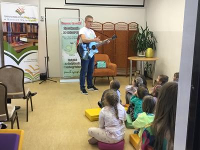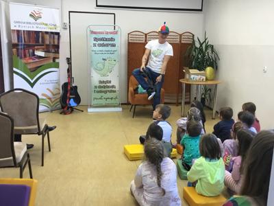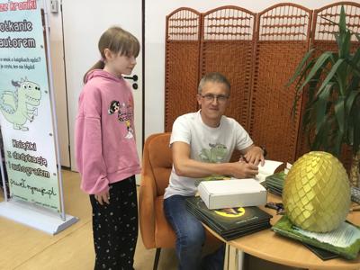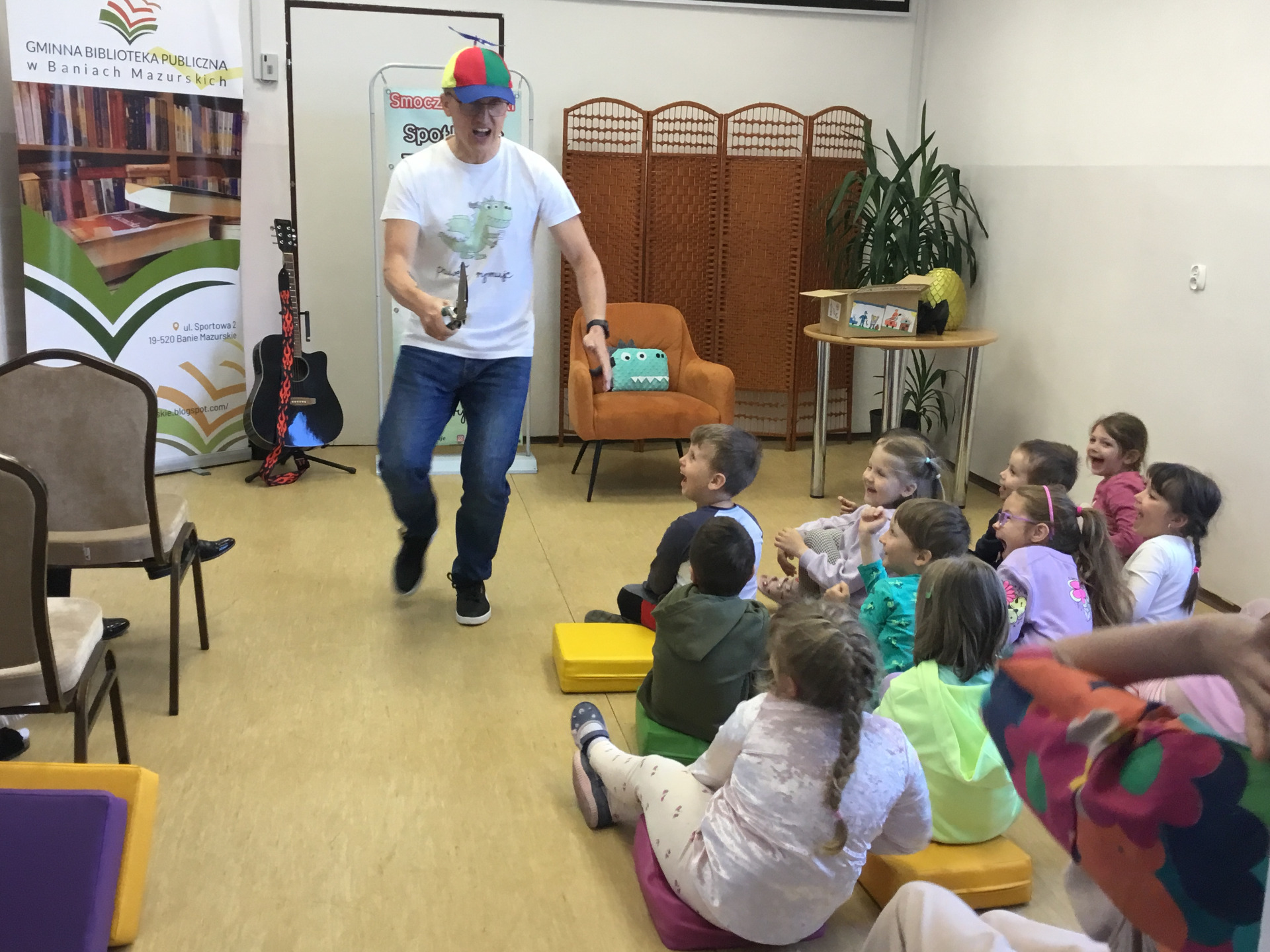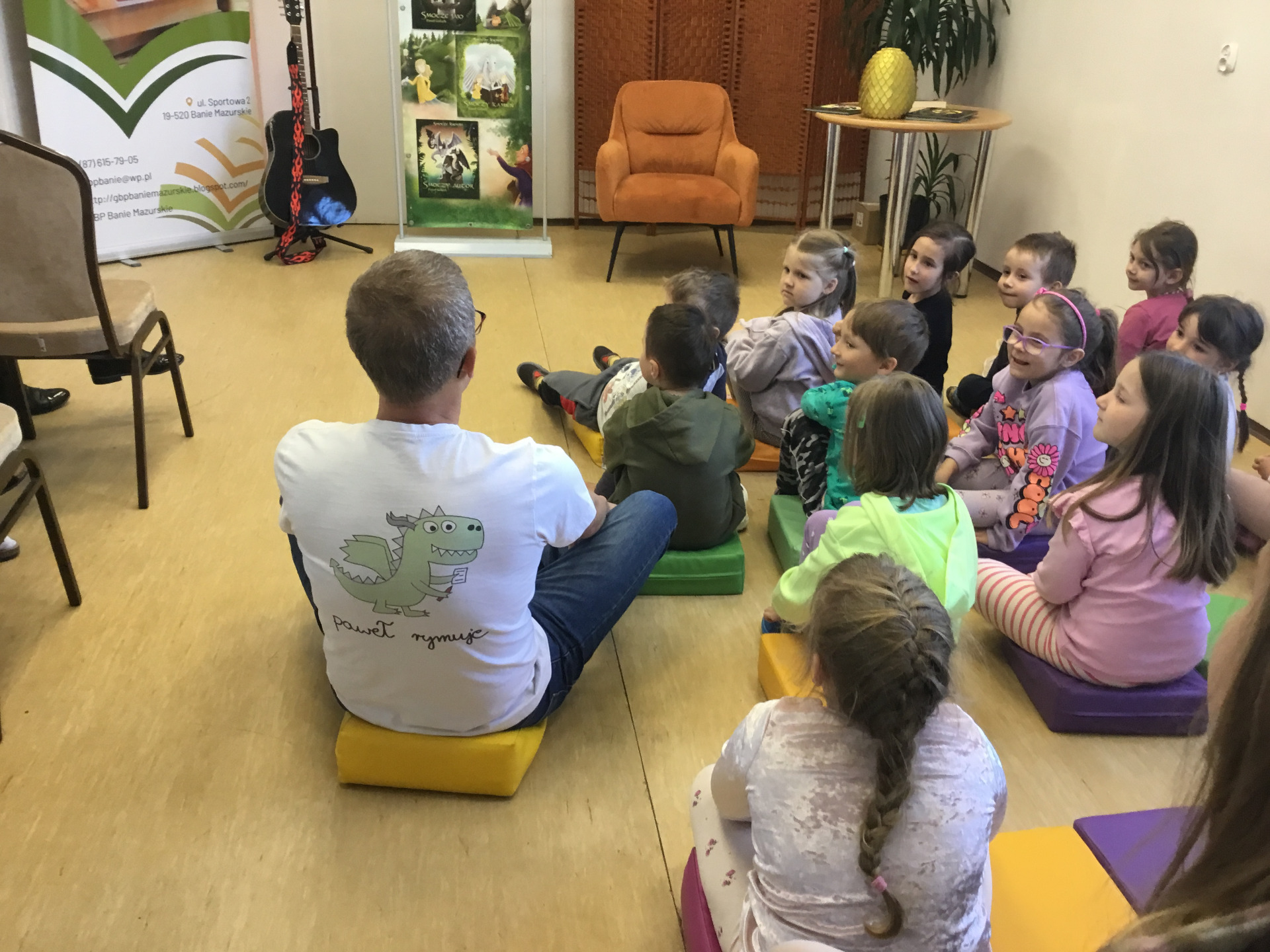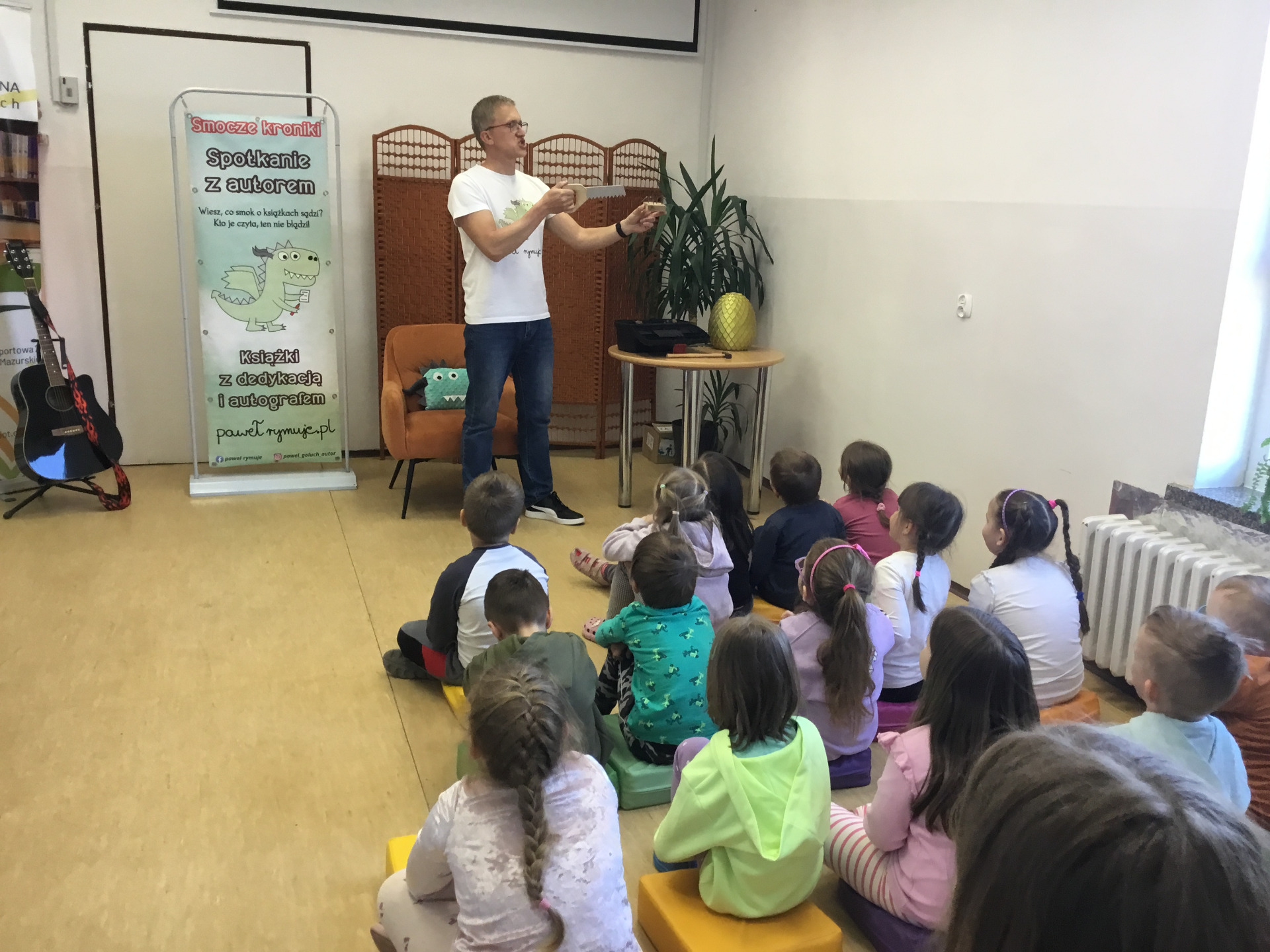 13 maja 2025 r. w Gminnej Bibliotece Publicznej w Baniach Mazurskich gościliśmy pana Pawła Gołucha – pisarza i poetę, autora książek dla dzieci. W spotkaniu wzięły udział dzieci z grupy przedszkolnej 5 - latków z Publicznego Przedszkola Samorządowego w Baniach Mazurskich i starsi czytelnicy z rodzicami. Uczestnicy spotkania z ogromnym zainteresowaniem słuchali o tym, jak powstają rymy i wiersze i jak bawić się słowem! Pan Paweł nie tylko opowiadał o początkach swojej pisarskiej pracy, zaprezentował także swoje wiersze – zabawne, pełne humoru, ale z morałem. Nie zabrakło również fragmentów książki Smocze jajo z serii Smocze Kroniki. Dzieci mogły aktywnie uczestniczyć w spotkaniu. Nie zabrakło wspólnej zabawy przy dźwiękach gitary, a śmiechom i oklaskom nie było końca.