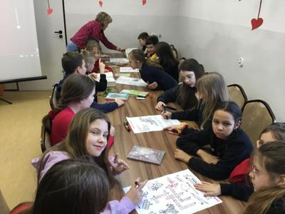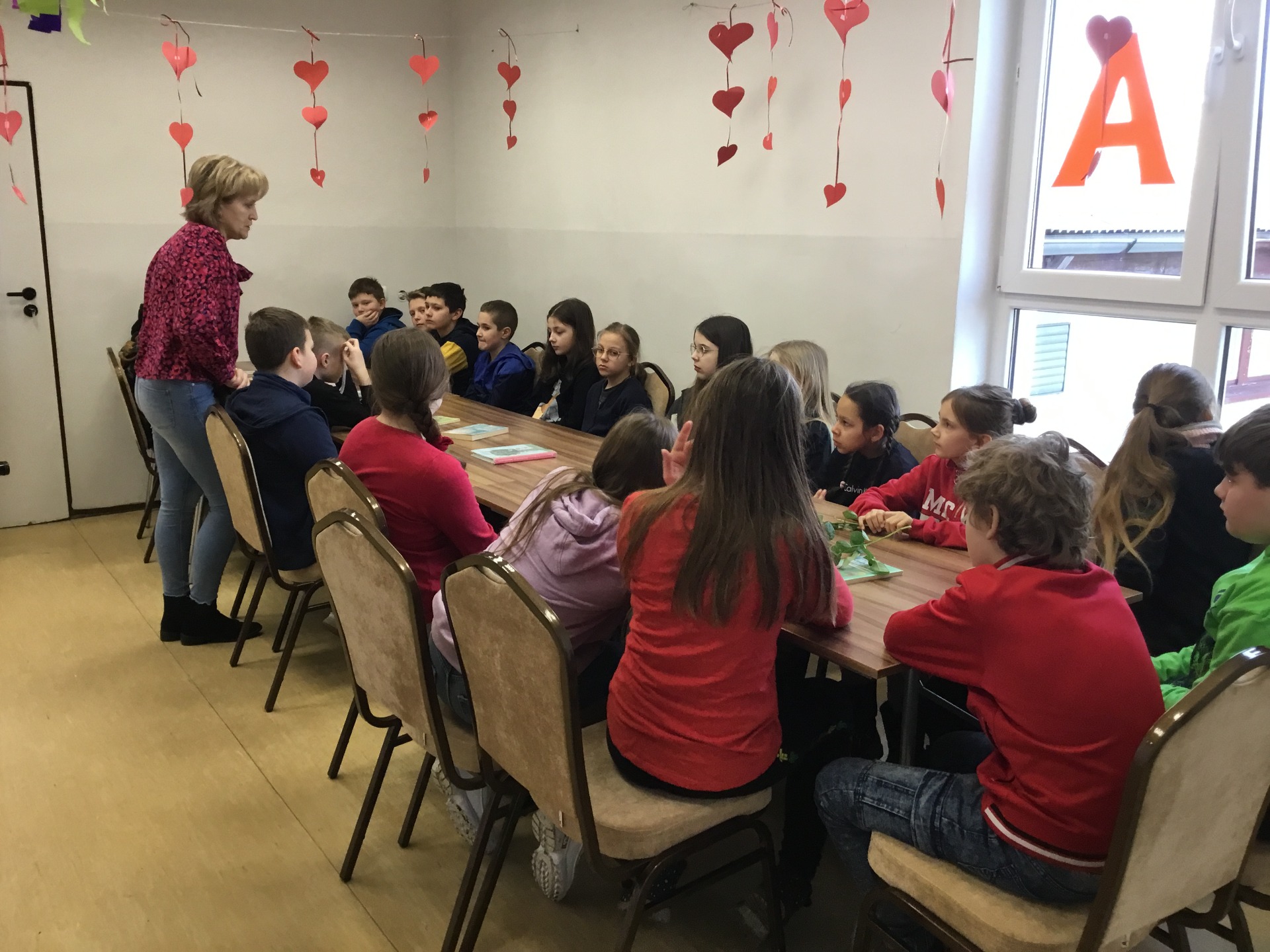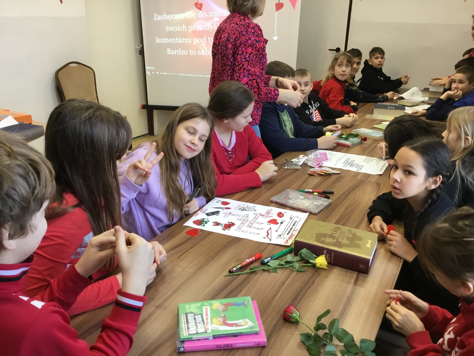Lekcja biblioteczna z okazji przypadającego w lutym dnia Świętego Walentego w Gminnej Bibiotece Publicznej w Baniach Mazurskich