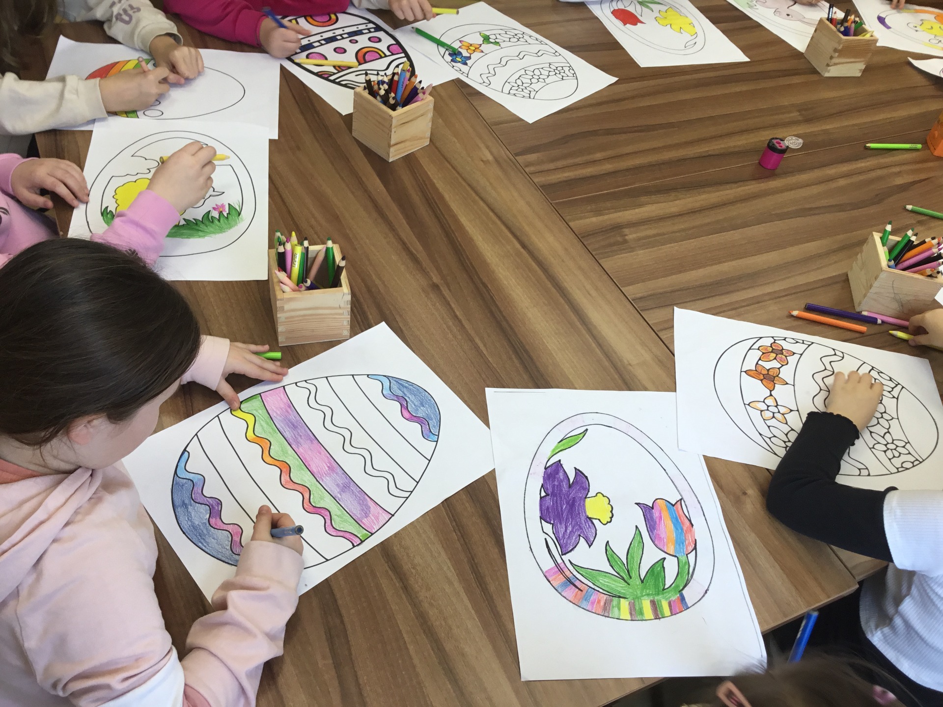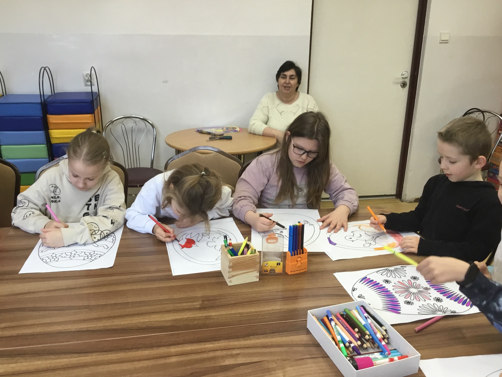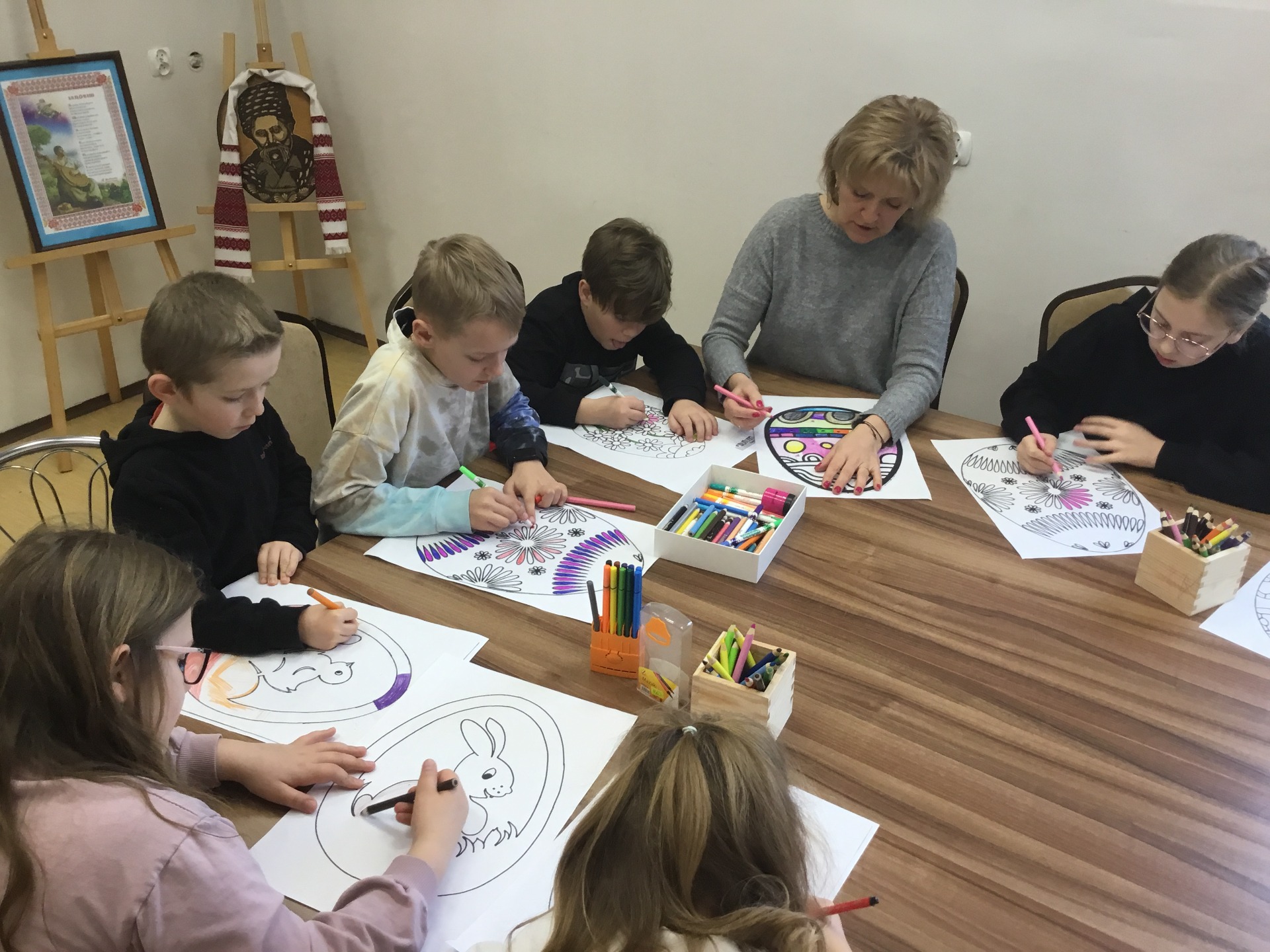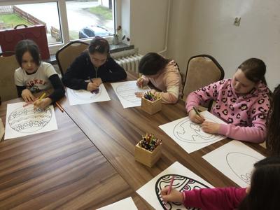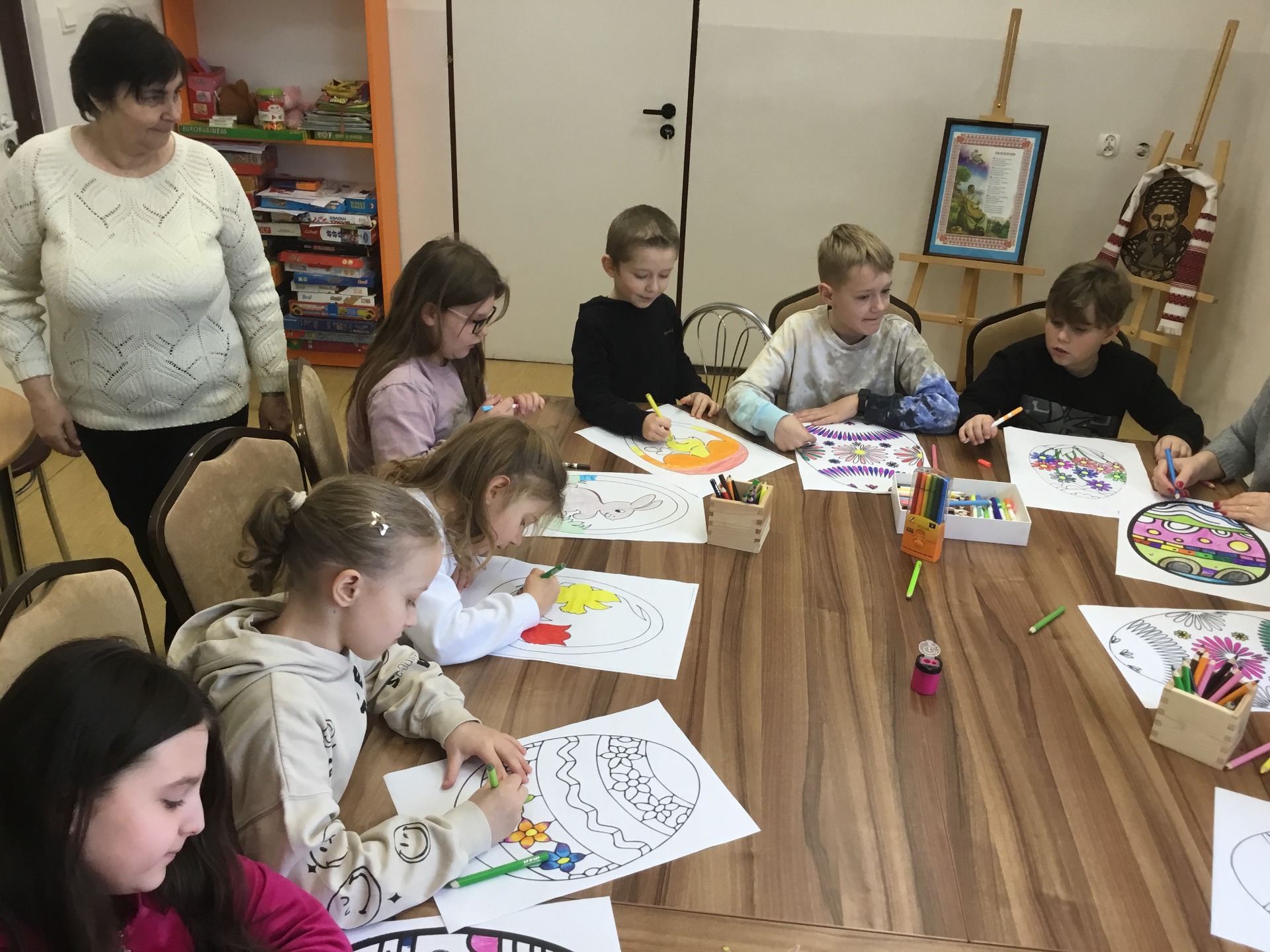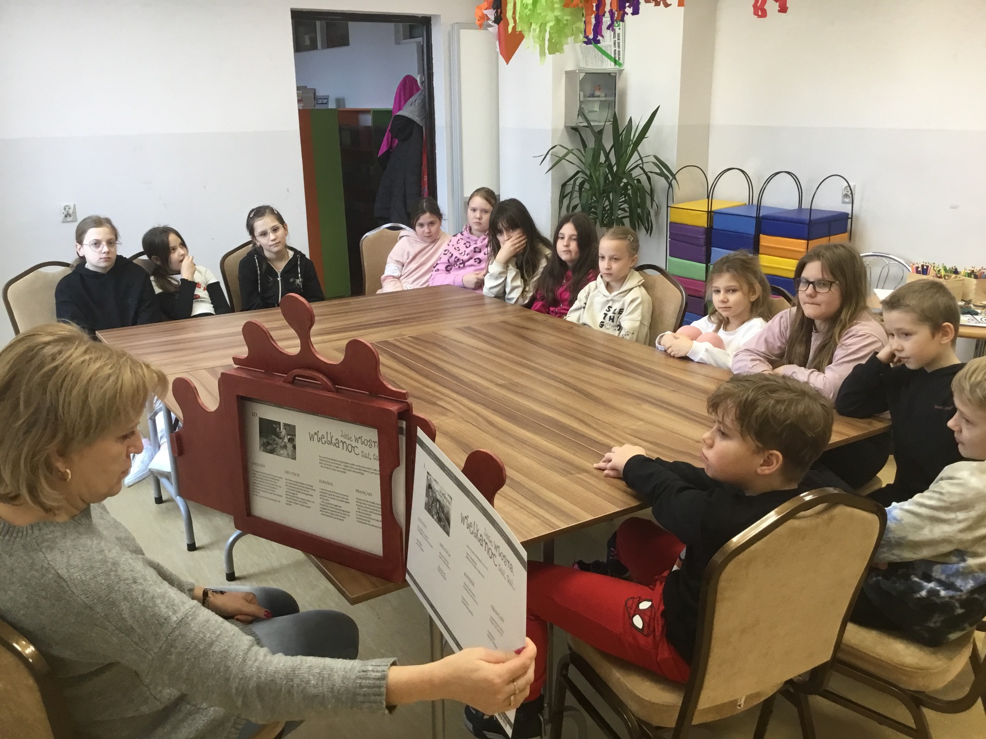 Wielkimi krokami zbliża się Wielkanoc - najbardziej wiosenne, kwitnące i pachnące Święta. To wyjątkowy, piękny i inspirujący czas. W naszej bibliotecznej ofercie nie mogło zatem zabraknąć zajęć o tematyce świątecznej. Z tej okazji 20 marca zaprosiliśmy uczniów klasy III Szkoły Podstawowej w Baniach Mazurskich zajęcia pt.„Nadeszła wiosna, a z nią pora Wielkanocna”. Na wstępie przedstawiliśmy dzieciom w formie teatrzyku kamishibai opowiadanie – „Idzie wiosna, Wielkanoc tuż-tuż". Rozmawialiśmy z dziećmi o tym, z czym kojarzą im się Święta Wielkanocne. W dalszej kolejności rozmawialiśmy o tradycji świąt wielkanocnych, dzieci opowiadały co dzieje się przed świętami w domu i w przyrodzie. Wspólnie zapełniały koszyczek wielkanocny, odgadując, co powinno się w nim znaleźć, pierwszym produktem było jajko. O ciekawostkach związanych z jajkiem i jego roli w przyrodzie dowiedzieliśmy się z książki Gallimarda Jeunessa pt. "Jako". Na koniec spotkania zaprosiliśmy dzieci do wykonania pięknych papierowych witraży z papieru. Każde dziecko otrzymało szablon do kolorowania o tematyce nawiązującej do świąt wielkanocnych. Po zalaminowaniu i wycięciu pracy plastycznej każdy witraż znalazł miejsce w oknie naszej biblioteki.