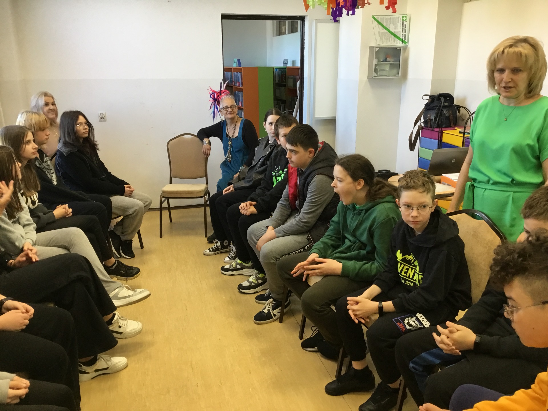 8 maja 2024 r. w Gminnej Bibliotece Publicznej w Baniach Mazurskich odbyły się warsztaty teatralne skierowane do młodzieży. Na spotkanie zaprosiliśmy uczniów klasy 6 z Szkoły Podstawowej w Baniach Mazurskich wraz z wychowawczynią panią Grażyną Czebanyk. Warsztaty przeprowadziła Małgorzata Jędrzejewska, instruktorka teatralna i kulturalna. Malgorzata Jedrzejewska mieszka obecnie w Iławie, pracowała jako polonistka, bibliotekarka, socjoterapeutka. Warsztaty pozwoliły uczestnikom poznać podstawowe elementy pracy na zajęciach teatralnych. Poprzez ćwiczenia improwizacyjne, logopedyczne oraz naukę umiejętności formułowania myśli, wyrażania emocji młodzież mogła przełamać bariery wstydu, skrępowania. Pani Małgorzata zaprosiła wszystkich do aktywnego włączenia się w instalacje, gry i zabawy teatralne, dzięki temu powstały ciekawe krótkie spektakle. Młodzież mogła poczuć się jak prawdziwi aktor na scenie.