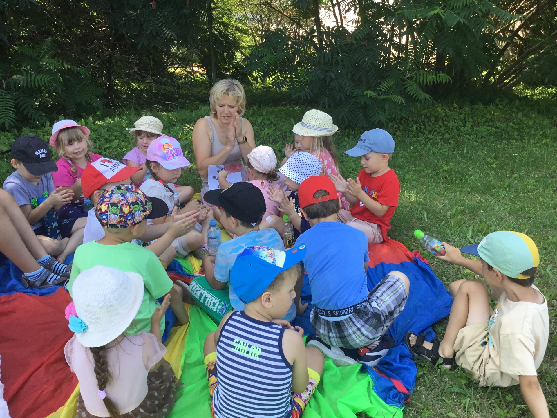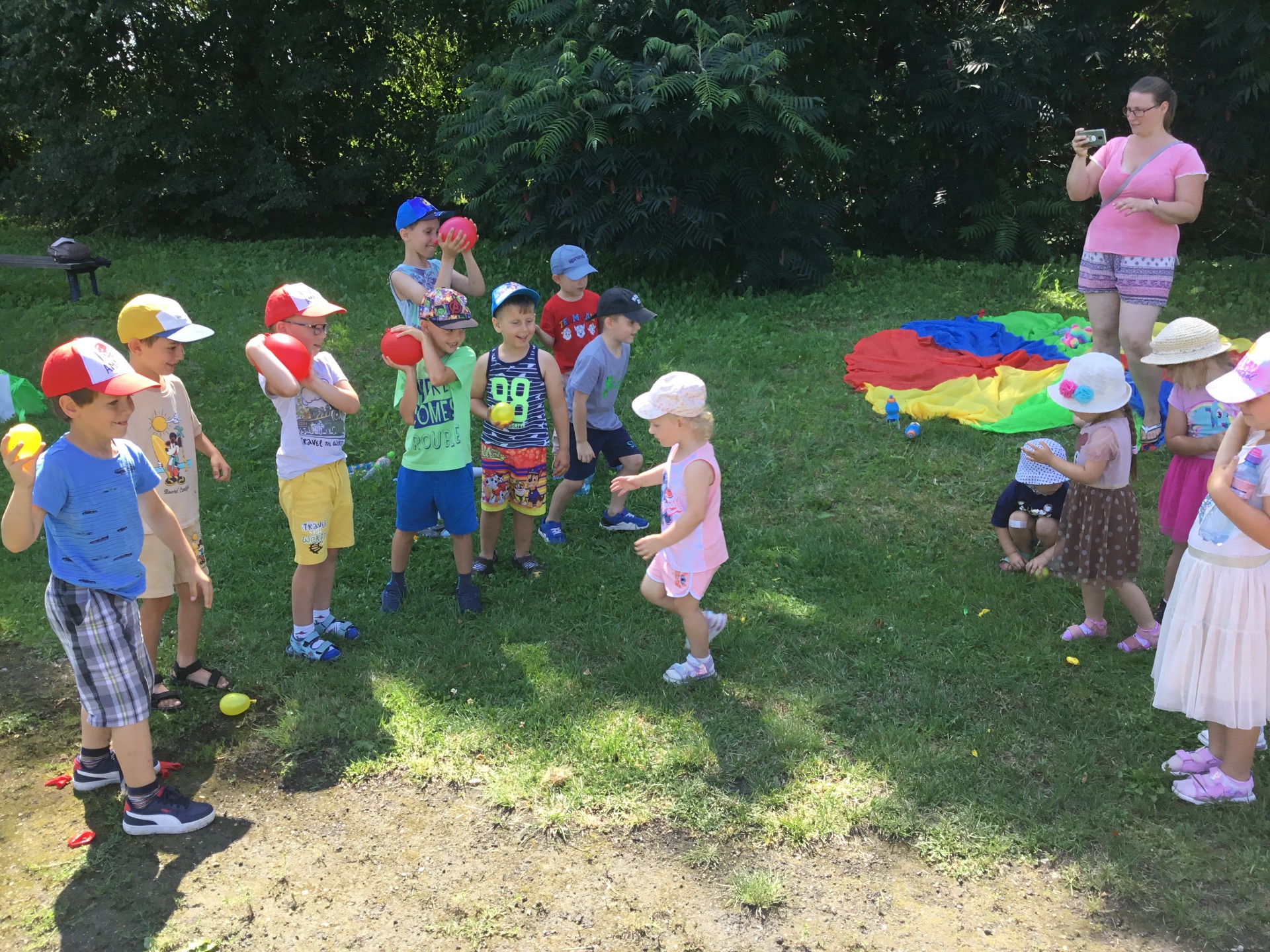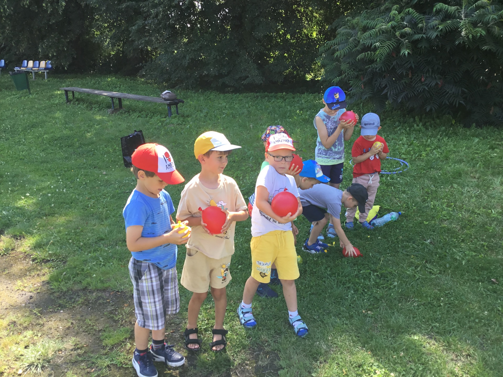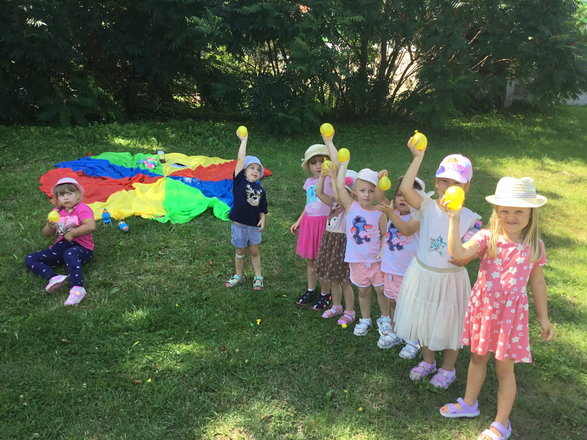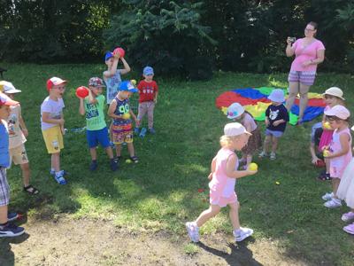 Jak co tydzień, 22 lipca 2024 roku w poniedziałkowe przedpołudnie spotkaliśmy się z dziećmi z Publicznego Przedszkola Samorządowego na boisku, aby wspólnie cieszyć się literaturą na świeżym powietrzu. Tematem dzisiejszego spotkania były najbardziej znane i lubiane polskie rymowanki "Wpadła gruszka do fartuszka i inne rymowanki". Dzieci świetnie sobie poradziły z rymowankami. Dla ochłody w ten piękny wakacyjny dzień zaprosiliśmy dzieci do udziału w bitwie na balony wodne.