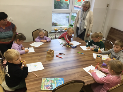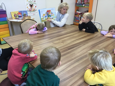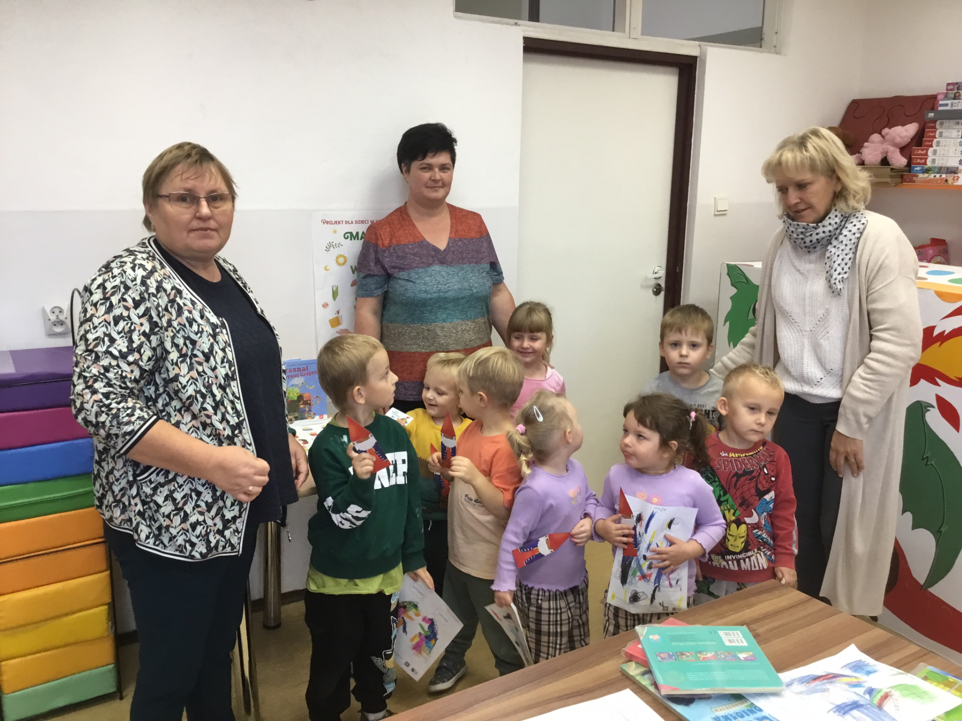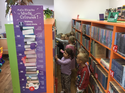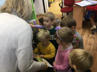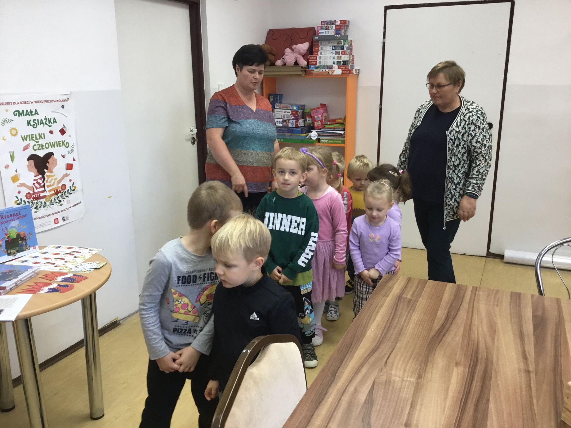Przedszkolaki dowiedziały się co to za miejsce, jak nazywa się osoba, która tu pracuje, jak można stać się czytelnikiem biblioteki oraz jak należy korzystać z księgozbioru. Poznały również zasady zachowania się w bibliotece. Z wielkim zainteresowaniem słuchały wszystkich informacji oraz z chęcią oglądały kolorowe i bogato ilustrowane książeczki. Kolorowały kolorowanki promujące kampanię Mała książka - wielki człowiek i wysłuchały bajki pt. "Kurka złotonioska".
