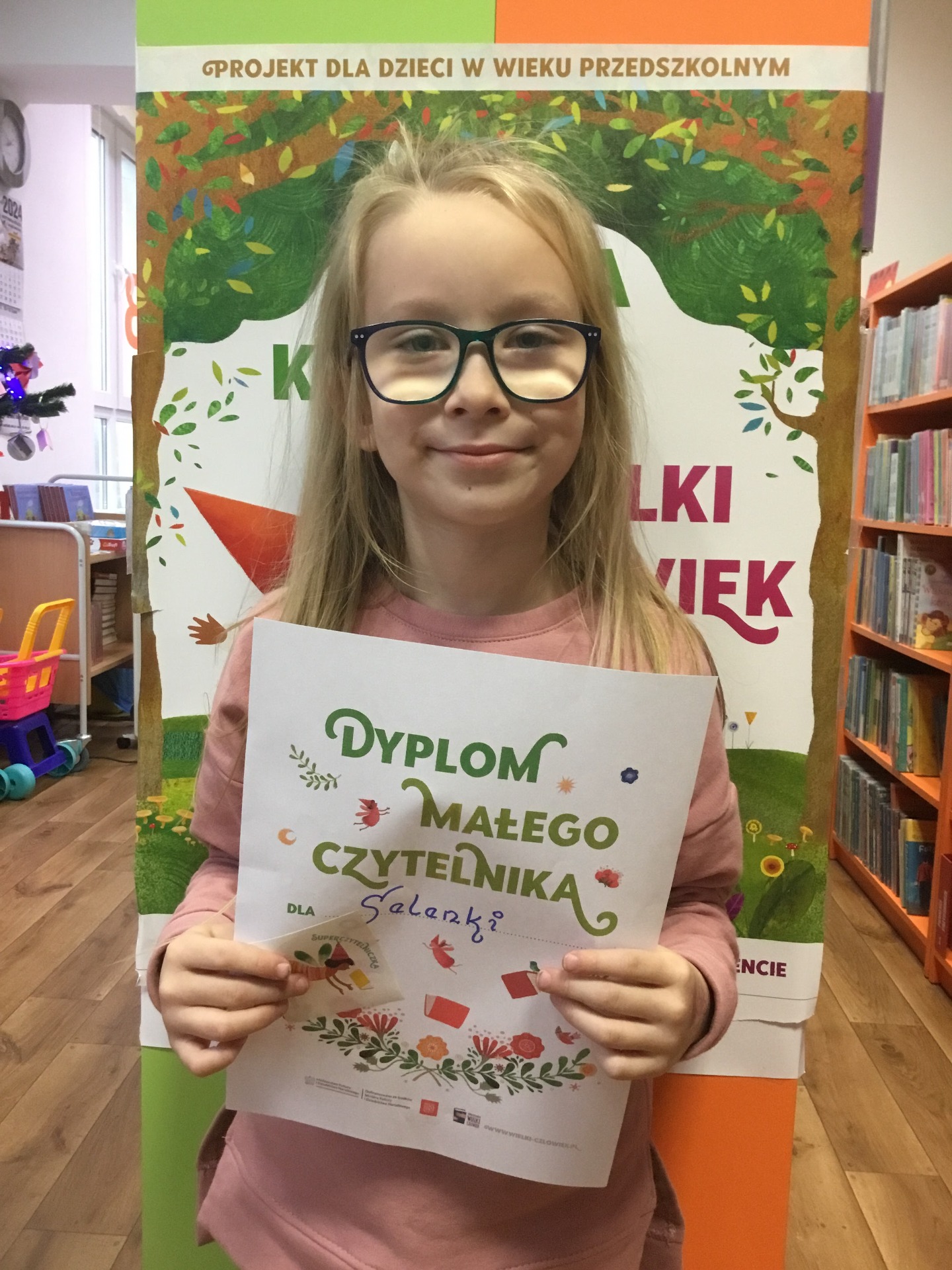 W miesiącu grudniu rozdaliśmy kolejne dyplomy i wyprawki naszym najmłodszym czytelniczkom. Gratulujemy naszym aktywnym Małym Czytelnikom. Kampania Mała książka – wielki człowiek jest realizowana w bibliotece. Każde dziecko w wieku przedszkolnym 3-6 lat otrzymuje nieodpłatnie Wyprawkę Czytelniczą oraz Kartę Małego Czytelnika. Za każdą wizytę w bibliotece, zakończoną wypożyczeniem minimum jednej książki z księgozbioru dziecięcego, Mały Czytelnik otrzyma naklejkę, a po zebraniu dziesięciu zostanie uhonorowany imiennym dyplomem.