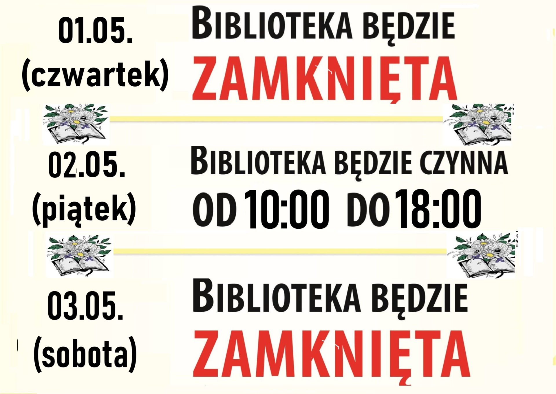 Zachęcamy do zrobienia zapasów książkowych wcześniej, natomiast jeśli wolicie zajrzeć do nas w majówkę to zapraszamy 2 maja (piątek) jesteśmy dla Was otwarci w godz. 10:00-18:00.