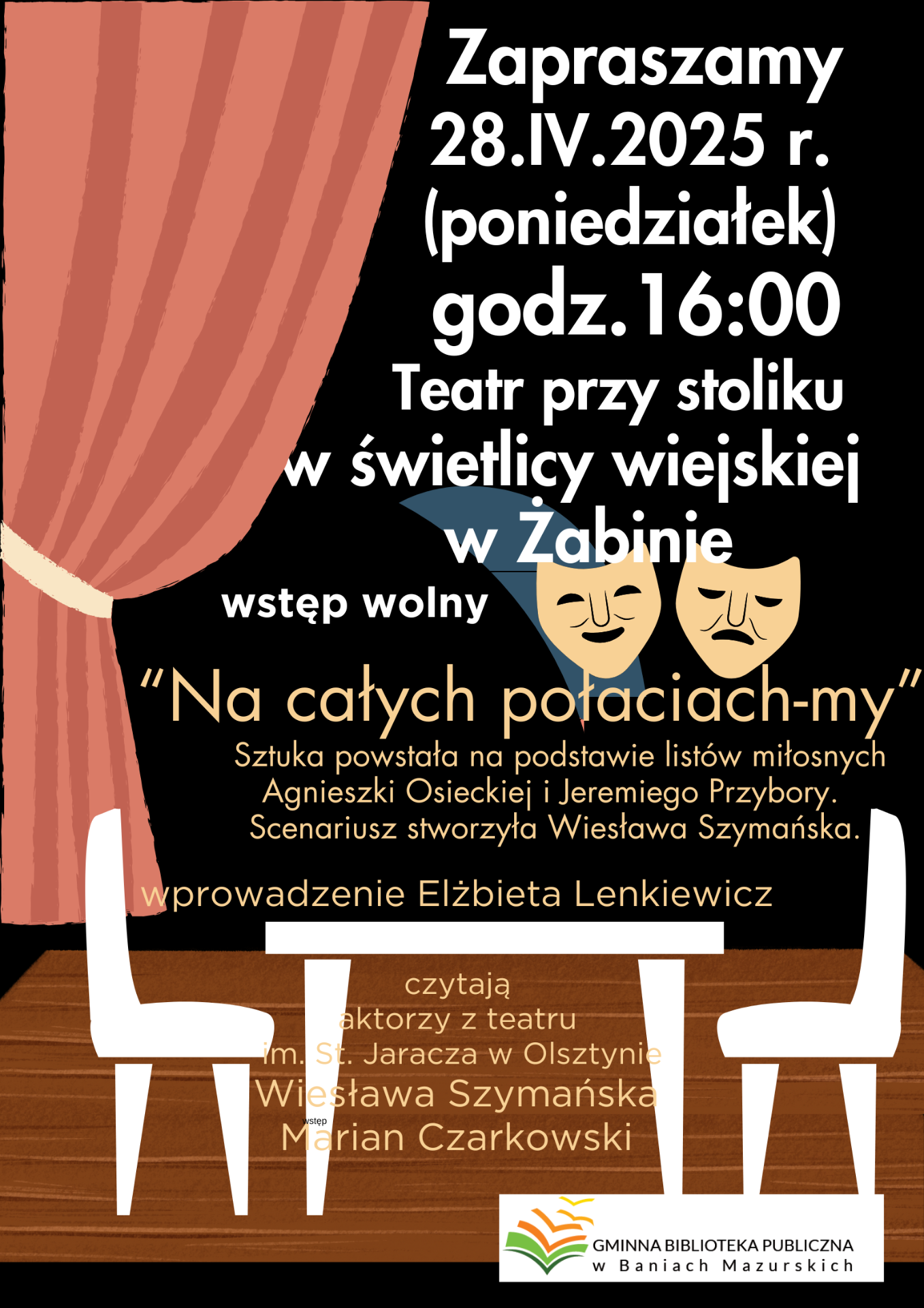 Zapraszamy na spotkanie z cyklu Teatr przy stoliku - Na całych połaciach-my do świetlicy wiejskiej w Żabinie