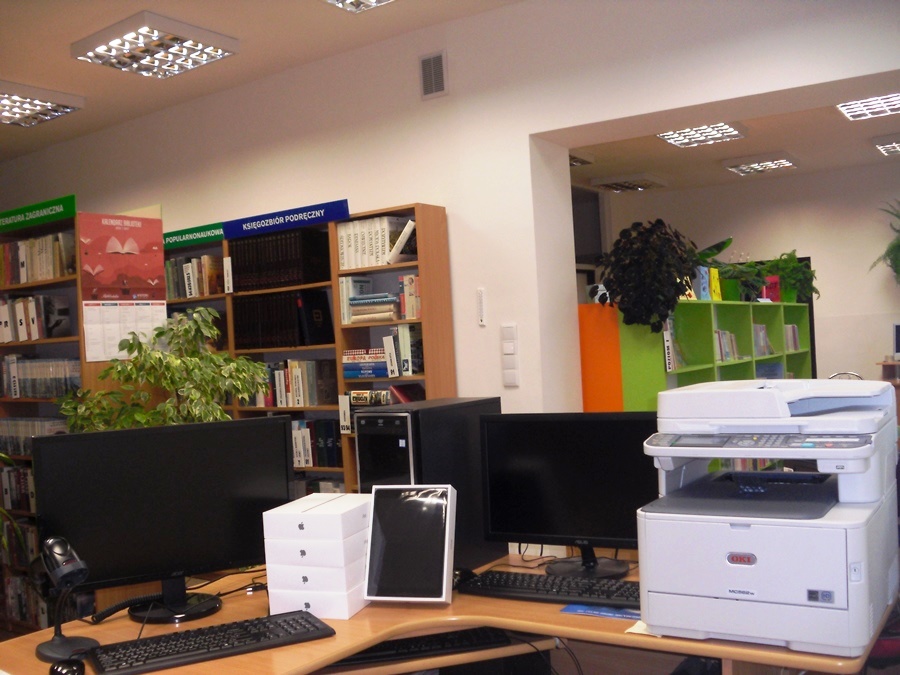 Dzięki tej dotacji zakupiliśmy 1 zestaw komputerowy, 1 urządzenie wielofunkcyjne, 5 Apple iPad oraz 1 monitor, 2 czytniki kodów, 1 klawiaturę komputerową, 1 mysz komputerową, 1 listwę zasilającą. Nowoczesny sprzęt komputerowy umożliwi tworzenie elektronicznego katalogu bibliotecznego - dostępnego również online, bazy użytkowników placówki, rejestracje wypożyczeń i udostępnień zasobów oraz prowadzenie statystyki bibliotecznej. Apple iPady wykorzystamy w prowadzeniu ciekawych zajęć dla różnych grup użytkowników.