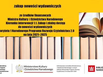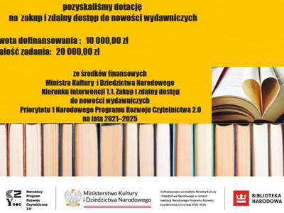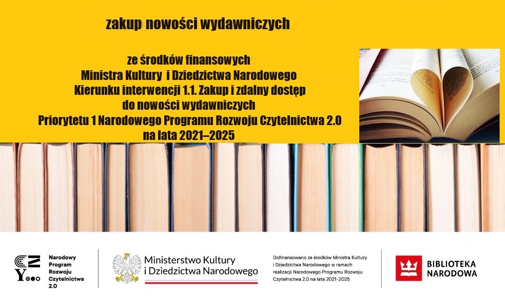 Dofinansowano ze środków finansowych Ministra Kultury i Dziedzictwa Narodowego w ramach realizacji Narodowego Programu Rozwoju Czytelnictwa 2.0 na lata 2021-2025”, zadania: „Dofinansowania dla bibliotek publicznych na zakup nowości wydawniczych oraz usługi zdalnego dostępu do książek w formatach e-booków i/lub audiobooków i/lub synchrobooków – Priorytet 1, Kierunek interwencji 1.1. w ramach NPRCz 2.0”
