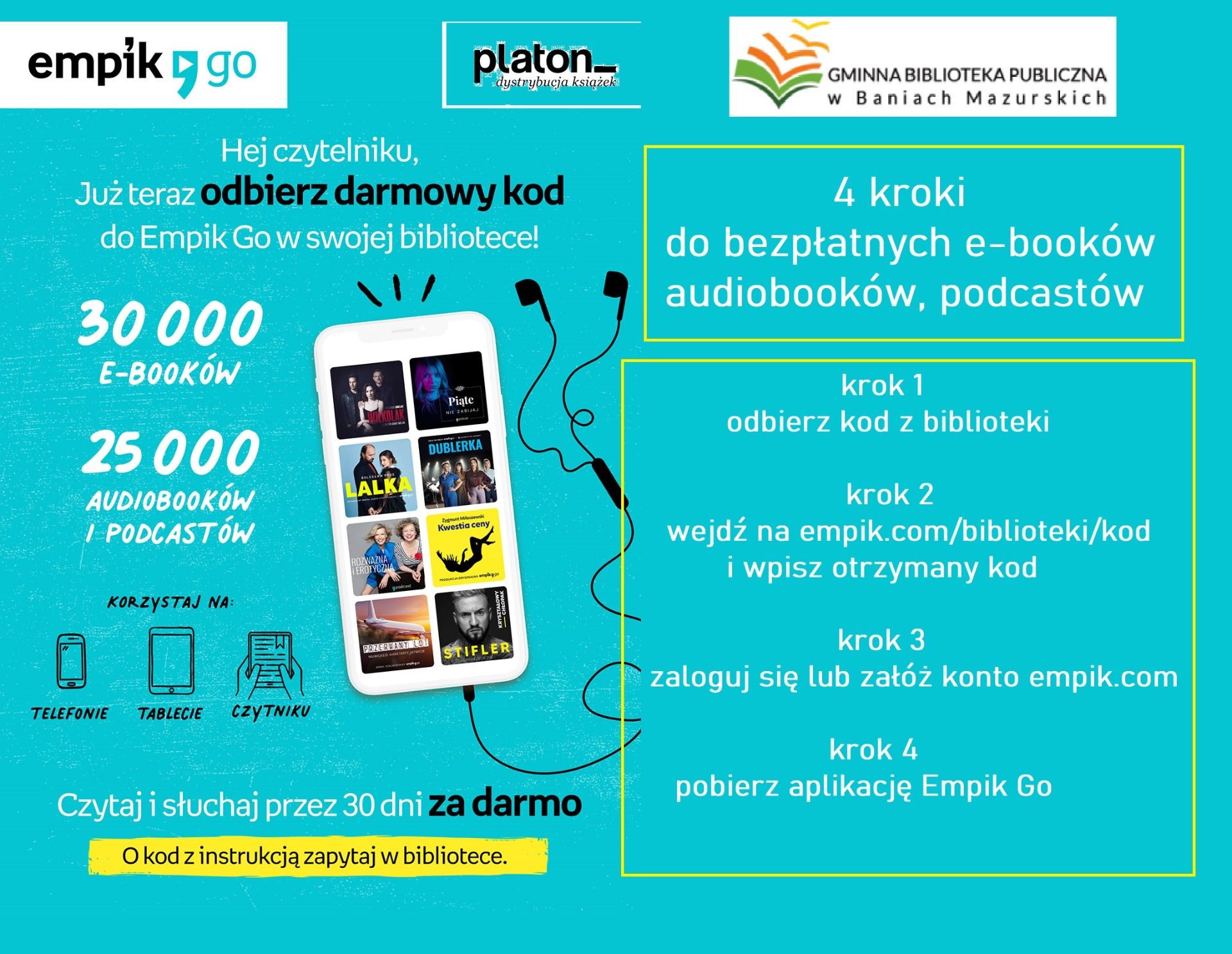 Kod umożliwia dostęp do aplikacji Empik Go, dzięki której czytelnicy mogą uzyskać bezpłatne kody do ponad 70 000 ebooków, audiobooków i podcastów, w tym do unikalnych produkcji własnych Empik Go.