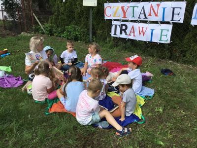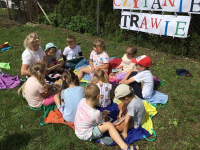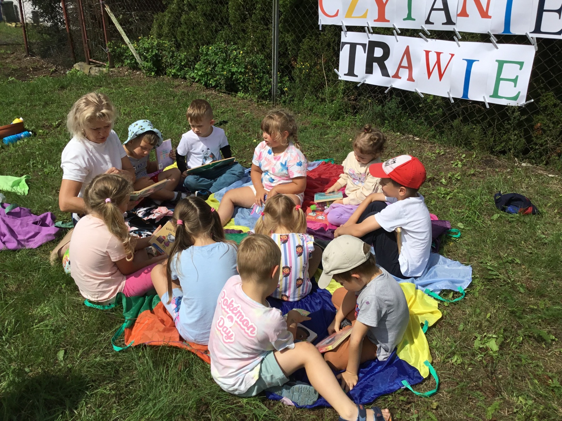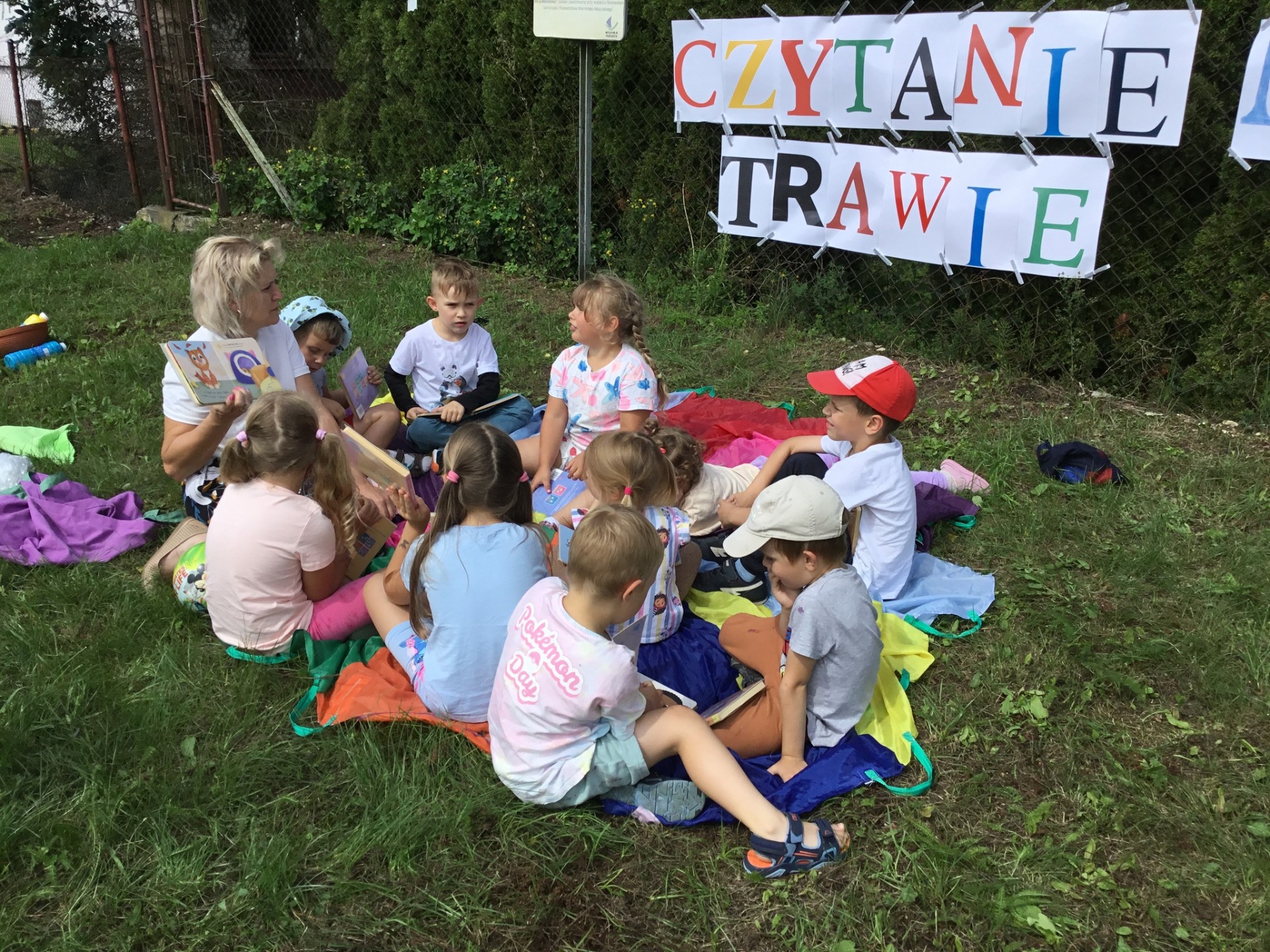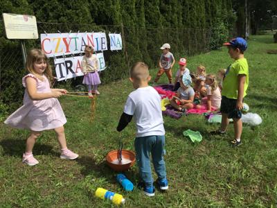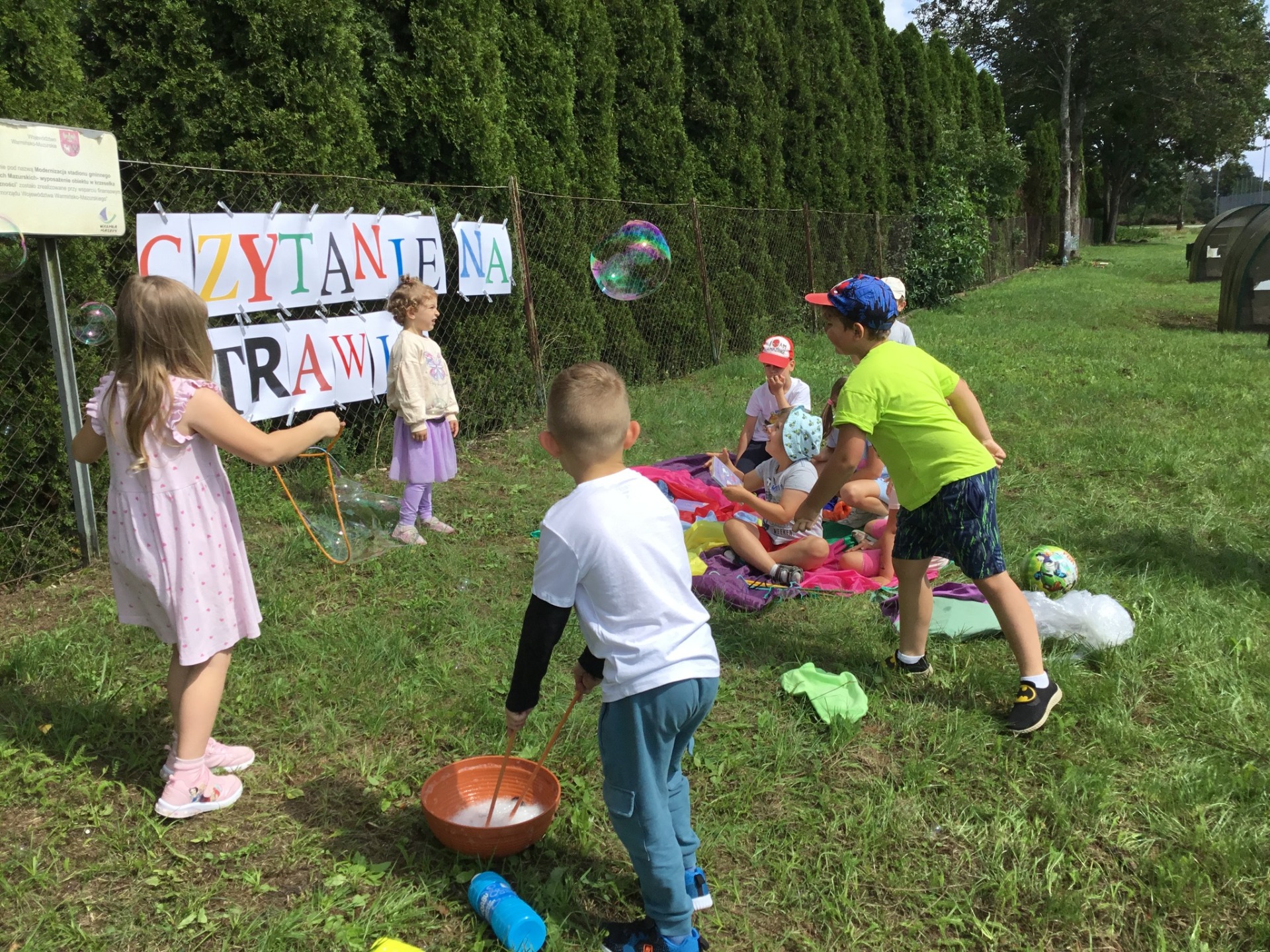Przeczytaliśmy kilka książeczek o naszych milusińskich futerkowych przyjaciołach. Głośne czytanie książek pt. "Kotek foszek", "Lwiątko, książątko", "Kocia Kocia" pozwoliło dzieciom wysłuchać opowieści, rozwinąć ich wyobraźnię i wzbogacić zasób słownictwa. Czytanie na trawie jest alternatywą dla tradycyjnych zajęć w pomieszczeniach, angażującą i ciekawą formą edukacji. Puszczanie baniek sprawiło dzieciom wiele uśmiechu i radości.