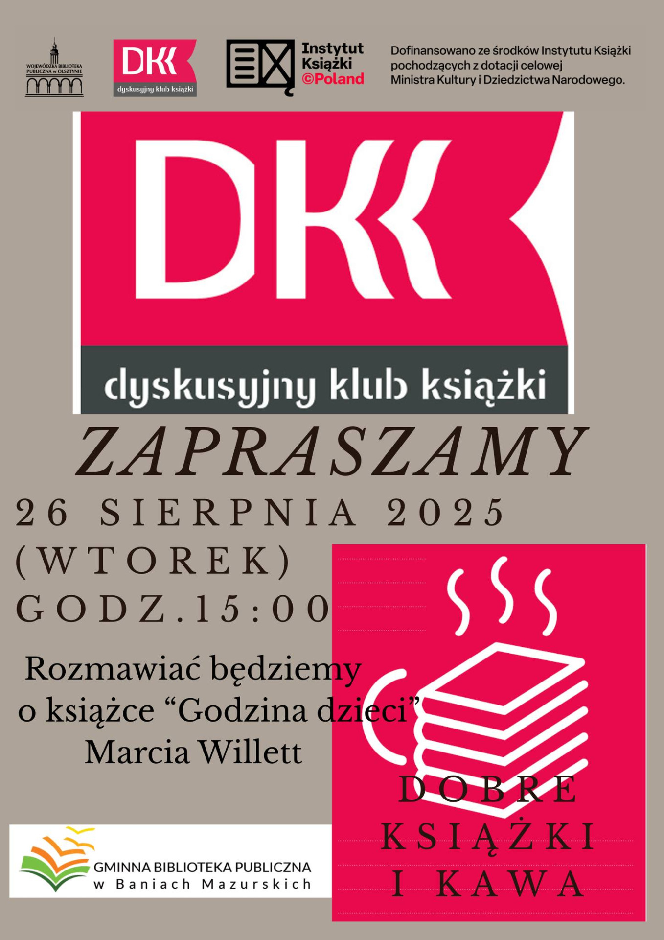 Dyskusyjny klub książki Zapraszamy, sierpniowe spotkanie DKK. 26.08.2025 r. (wtorek) godz.15:00. Drukuj Kopiuj link Facebook.com X.com Data publikacji: 22.08.2025 godz. 08:15 Wyświetlono: 14 Kategoria: Aktualności Tematyka: 2025 Tematyka: DKK Tematyka: Sierpień Zobacz również Zobacz więcej 11.08.2025 Aktualności 2025 Sierpień Wakacyjna nocka w bibliotece Wakacyjna nocka w bibliotece już za nami Wakacyjna nocka odbyła się w dniach 8-9 sierpnia 2025 r. Grupa 21 osób aktywnie spędziła noc w bibliotece. Wieczorna gra terenowa przeprowadzona na podstawie... 19.08.2025 Aktualności 2025 Sierpień Nowe technologie Przed nami warsztaty z nowych technologii. Zapisy zakończone, brak miejsc 18-20 sierpnia 2025 r. Liczba miejsc ograniczona. Trzy dni pełne inspirujących zajęć z zakresu programowania, nowych technologii... 19.08.2025 Aktualności 2025 Sierpień Pożegnanie lata w Widgirach Zapraszamy mieszkańców na piknik sołecki - Pożegnanie Lata w Widgirach. Wiata sołecka 30 sierpnia godz. 15:00