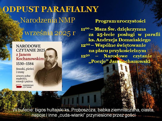 Narodowe Czytanie 2025 Organizatorzy zapraszają wszystkich parafian, mieszkańców na Odpust Parafialny, podczas którego odbędzie się Narodowe Czytanie 2025 Drukuj Kopiuj link Facebook.com X.com Data publikacji: 04.09.2025 godz. 10:53 Wyświetlono: 33 Kategoria: Aktualności Tematyka: 2025 Tematyka: Wrzesień Zobacz również Zobacz więcej 29.08.2025 Aktualności 2025 DKK Sierpień Sierpniowe spotkanie DKK Sierpniowe spotkanie DKK W czytelni biblioteki odbyło się kolejne spotkanie Dyskusyjnego Klubu Książki, podczas którego klubowiczki omawiały książkę "Godzina dzieci" autorstwa M. Willett. Wzruszająca... 01.09.2025 Aktualności 2025 Wrzesień Ekspedycja Zientara-Malewska Zapraszamy do podziwiania wystawy mobilnej "Ekspedycja Zientara-Malewska". Wystawa do końca września znajduje się w naszej bibliotece. Poezja Marii Zientary-Malewskiej mówi o dawnych obyczajach... 02.09.2025 Aktualności 2025 Wrzesień ZAPRASZAMY do korzystania z usług okładania książek,... Zapraszamy do korzystania z usługi okładania książek, podręczników, zeszytów w bibliotece Gminna Biblioteka Publiczna w Baniach Mazurskich zaprasza do korzystania z usług okładania...