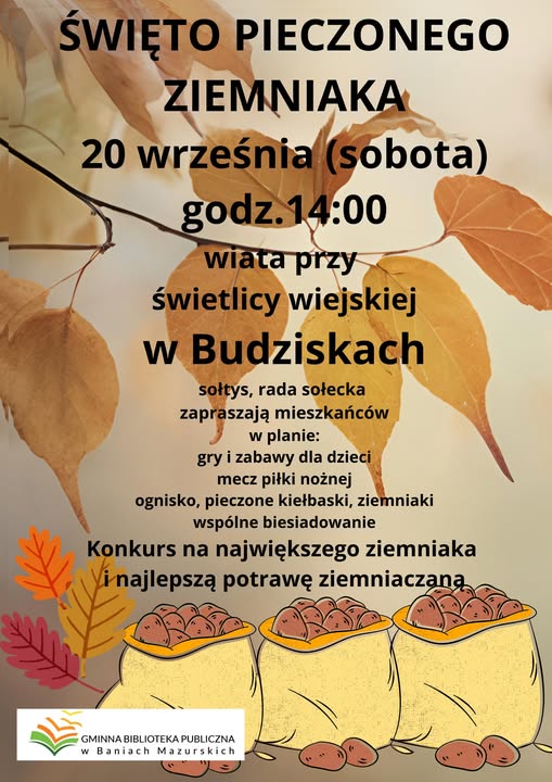 Sołtys i Rada Sołecka zapraszają mieszkańców sołectwa Budziska oraz sąsiednich sołectw na spotkanie, biesiadę z okazji Dnia Pieczonego Ziemniaka.
