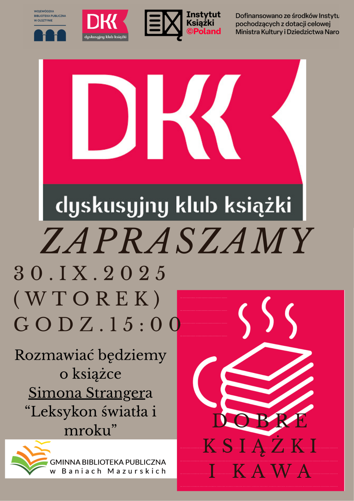 Dyskusyjny Klub Książki Zapraszamy, wrześniowe spotkanie DKK 30.09.2025 r. (wtorek) godz.15:00 Drukuj Kopiuj link Facebook.com X.com Data publikacji: 25.09.2025 godz. 14:16 Wyświetlono: 19 Kategoria: Aktualności Tematyka: 2025 Tematyka: DKK Tematyka: Wrzesień Zobacz również Zobacz więcej 15.09.2025 Aktualności 2025 Wrzesień Święto pieczonego ziemniaka Sołtys i Rada Sołecka zapraszają mieszkańców sołectwa Budziska oraz sąsiednich sołectw na spotkanie, biesiadę z okazji Dnia Pieczonego Ziemniaka. 20 września godz. 14:00 wiata przy świetlicy... 16.09.2025 Aktualności 2025 Wrzesień Rozstrzygnięcie konkursu Najaktywniejszy Czytelnik... Czytanie jest jak podróż do innego świata, gdzie czas się zatrzymuje i wszystko jest możliwe” ... 19.09.2025 Aktualności 2025 Grudzień Listopad Październik Sierpień Wrzesień LOWE Banie Mazurskie Projekt „Uniwersytet Ludowy Pogranicza“ - jest realizowany na terenie gminy Banie Mazurskie. Głównym celem LOWE jest aktywizacja osób dorosłych i społeczności lokalnych na rzecz rozwoju...