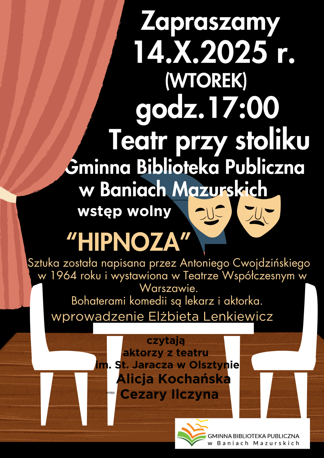 Zapraszamy na spotkanie z cyklu Teatr przy stoliku - Hipnoza do Gminnej Biblioteki Publicznej w Baniach Mazurskich