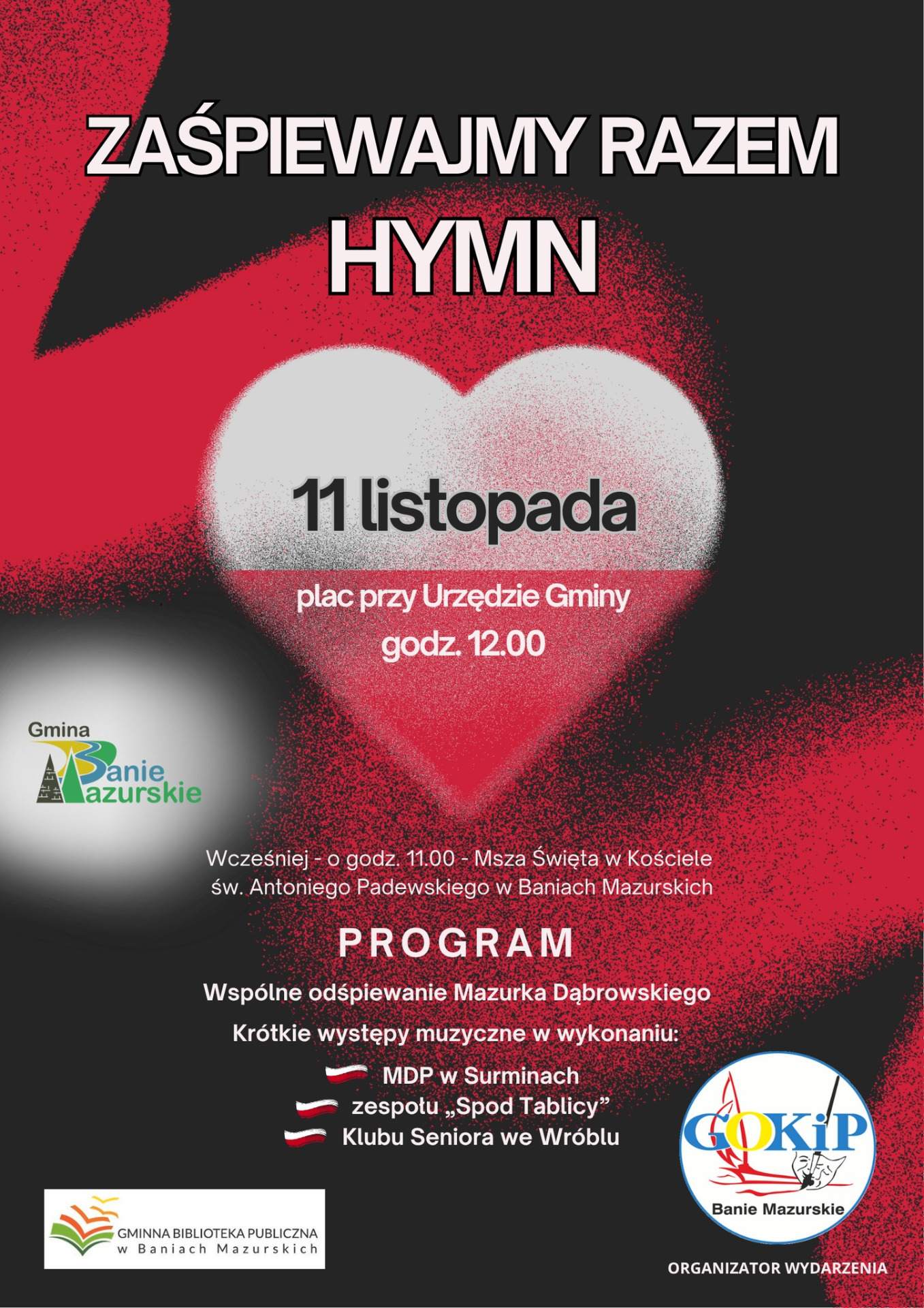 Z okazji Narodowego Święta Niepodległości, 11 listopada o godz. 12:00 na placu przy Urzędzie Gminy w Baniach Mazurskich, zaśpiewamy wspólnie Mazurka Dąbrowskiego.