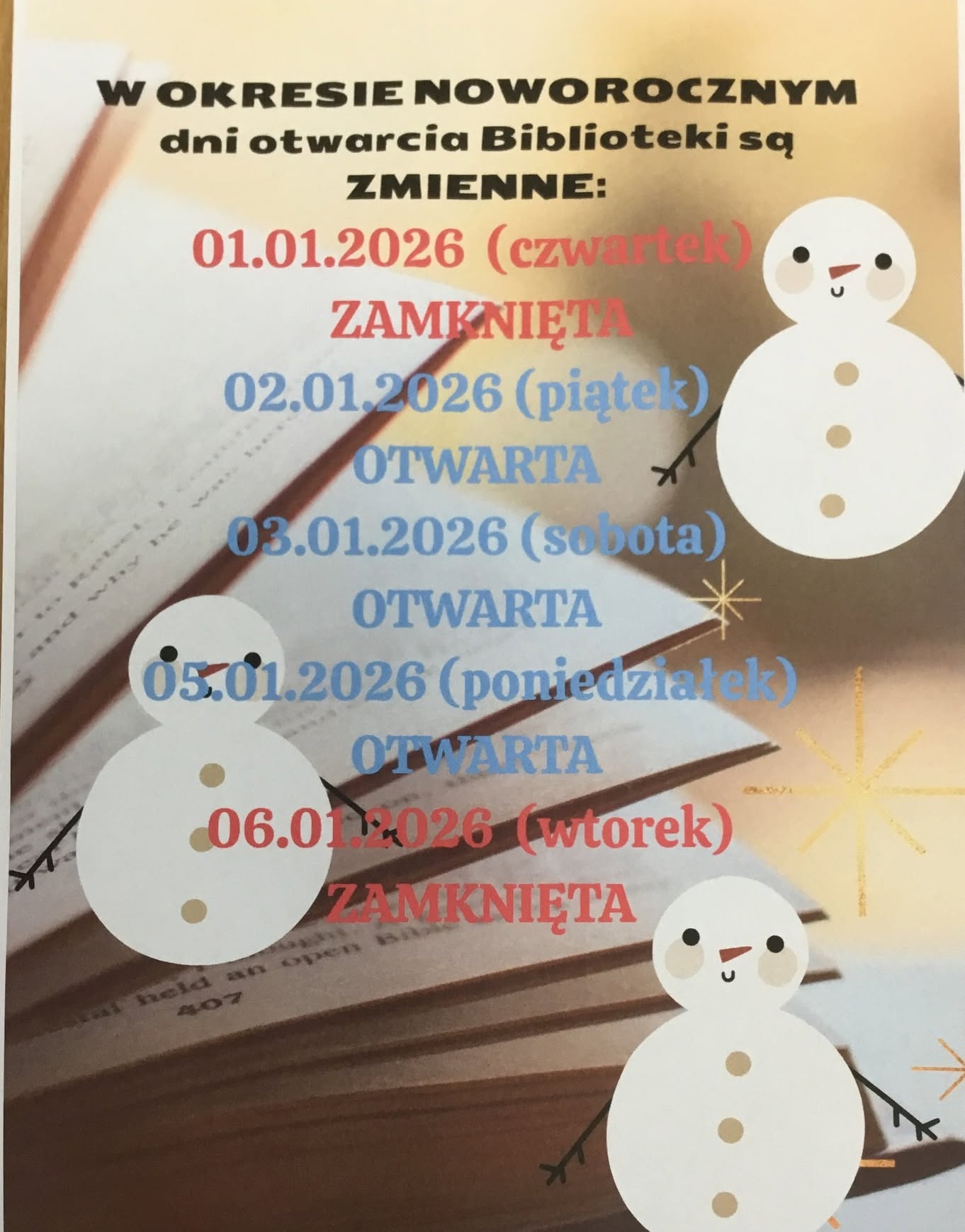 W OKRESIE NOWOROCZNYM dni otwarcia Gminnej Biblioteki są zmienne W OKRESIE NOWOROCZNYM dni otwarcia Biblioteki są ZMIENNE: 01.01.2026 (czwartek) - ZAMKNIĘTA 02.01.2026 (piątek) - OTWARTA 03.01.2026 (sobota) - OTWARTA 03.01.2026 (sobota) - OTWARTA 05.01.2026 (poniedziałek) - OTWARTA 06.01.2026 (wtorek) - ZAMKNIĘTA Drukuj Kopiuj link Facebook.com X.com Data publikacji: 03.01.2026 godz. 09:14 Wyświetlono: 18 Kategoria: Aktualności Tematyka: Grudzień Zobacz również Zobacz więcej 23.12.2025 Aktualności 2025 Grudzień Wystawa Świąteczny czas ogarnia nas, piękne choinki ze starych... 23.12.2025 Aktualności DKK Grudzień Zapraszamy na ostatnie w tym roku spotkanie dyskusyjnego... 23.12.2025 Aktualności 2025 Grudzień Życzenia z okazji Świąt Bożego Narodzenia