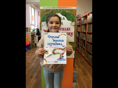 KolejnI czytelnicy postanowili rozpocząć swoją przygodę z książką. Przystąpili do projektu Mała książka - wielki człowiek, otrzymali wyprawki czytelnicze, na które składają się książka dla dziecka, poradnik dla rodziców, zakładka do książki oraz karta na naklejki. Kartę trzeba mieć ze sobą podczas kolejnych dziesięciu wizyt w bibliotece. Gdy cała wypełni się naklejkami, czytelnik otrzyma tytuł i dyplom Małego Czytelnika.