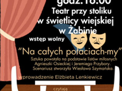Teatr przy Stoliku - "Na całych połaciach-my" Spektakl pod tym tytułem będzie można obejrzeć w poniedziałek 28 kwietnia 2025 r. o godz. 16.00 w świetlicy wiejskiej w Żabinie. Aktorzy Teatru Stefana...
