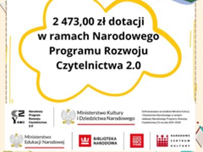 Miło nam poinformować, że otrzymaliśmy informację o przyznaniu dotacji w wysokości 2 473,00 zł na zakup książek do naszej biblioteki w ramach zadania "Dofinansowania dla bibliotek publicznych na...