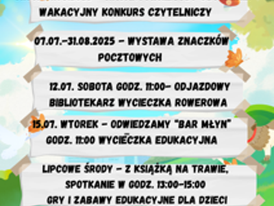 02.07.2025 Aktualności 2024 Lipiec Wakacje z Gminną Biblioteką Publiczną w Baniach Mazurskich.... Liczba miejsc ograniczona, zapisy w bibliotece lub pod numerem telefonu 87 615 79 05